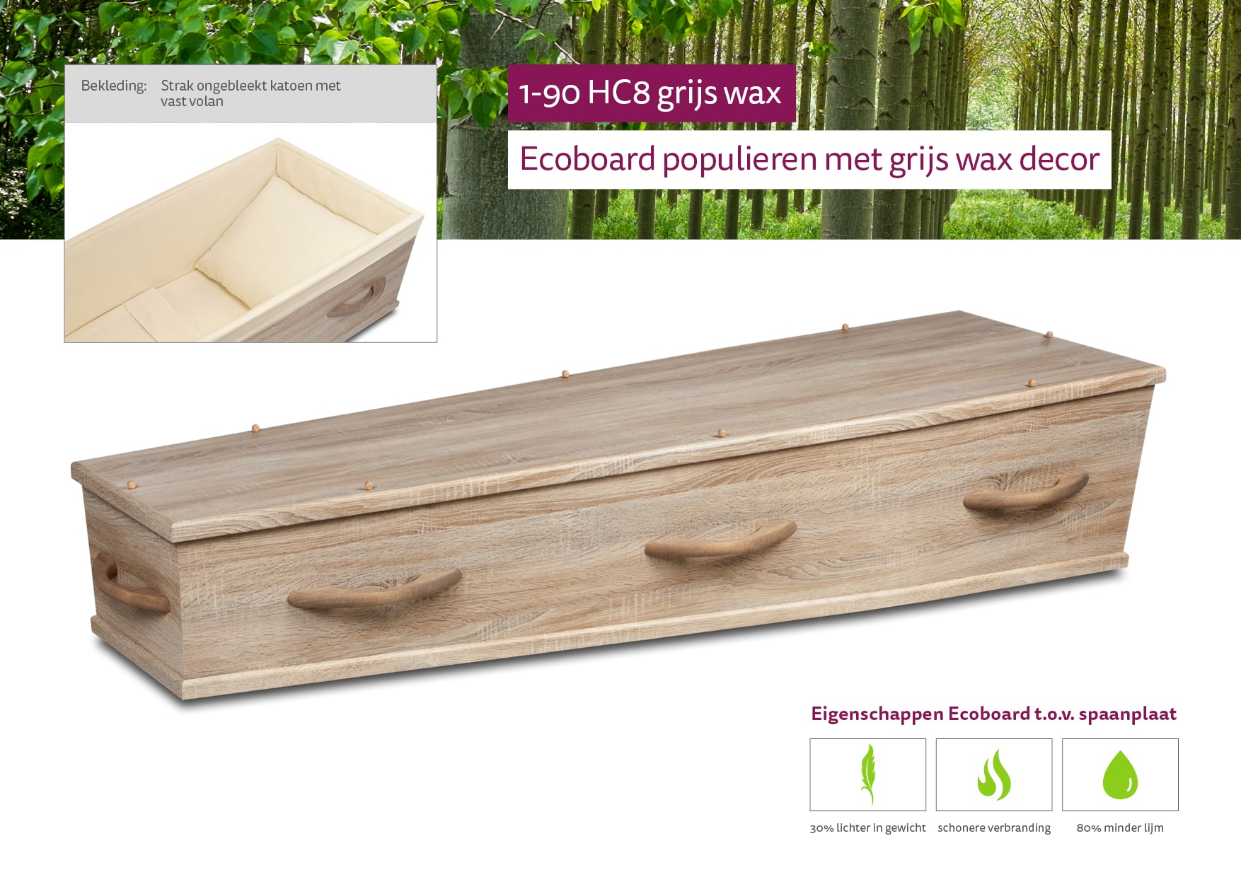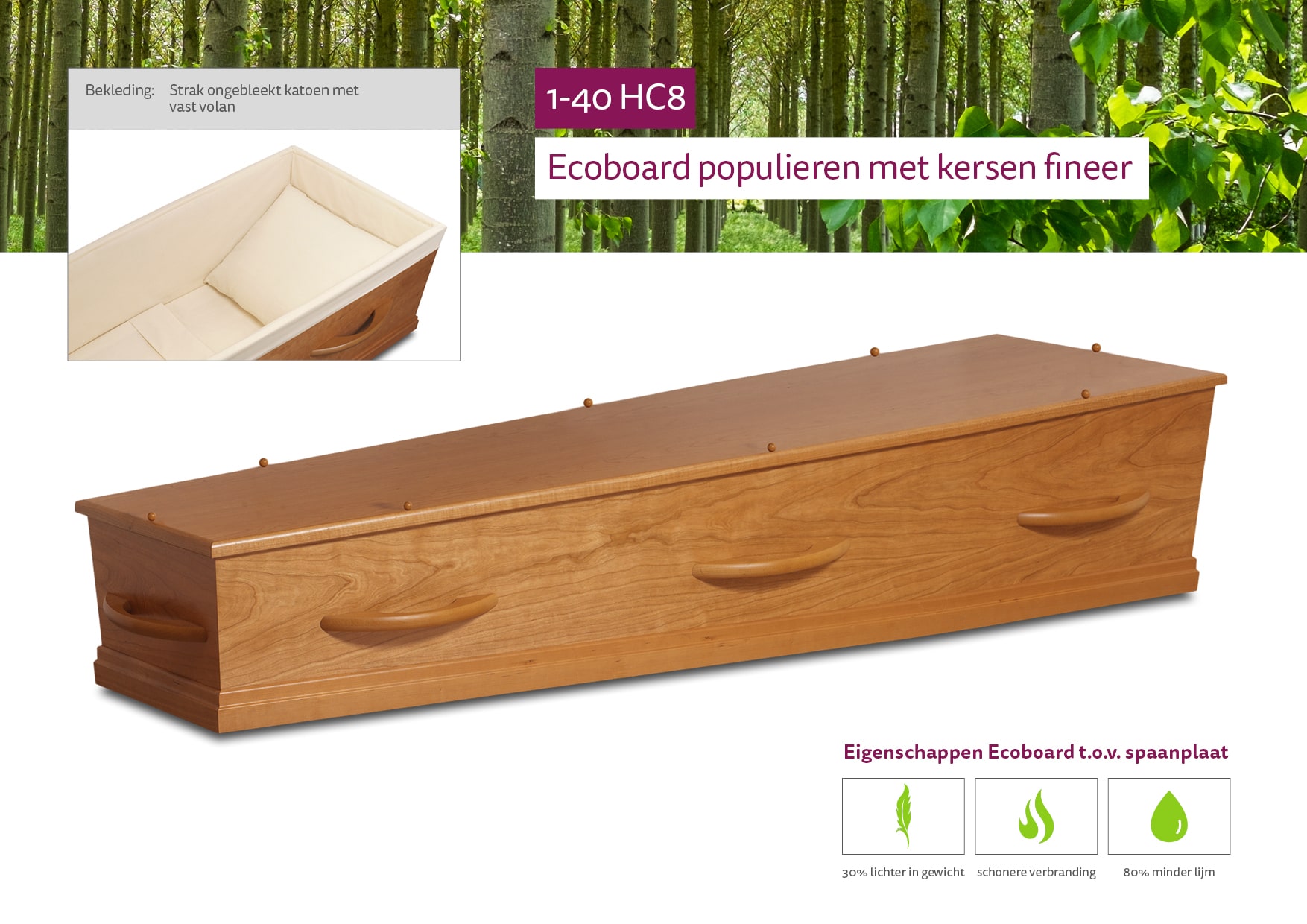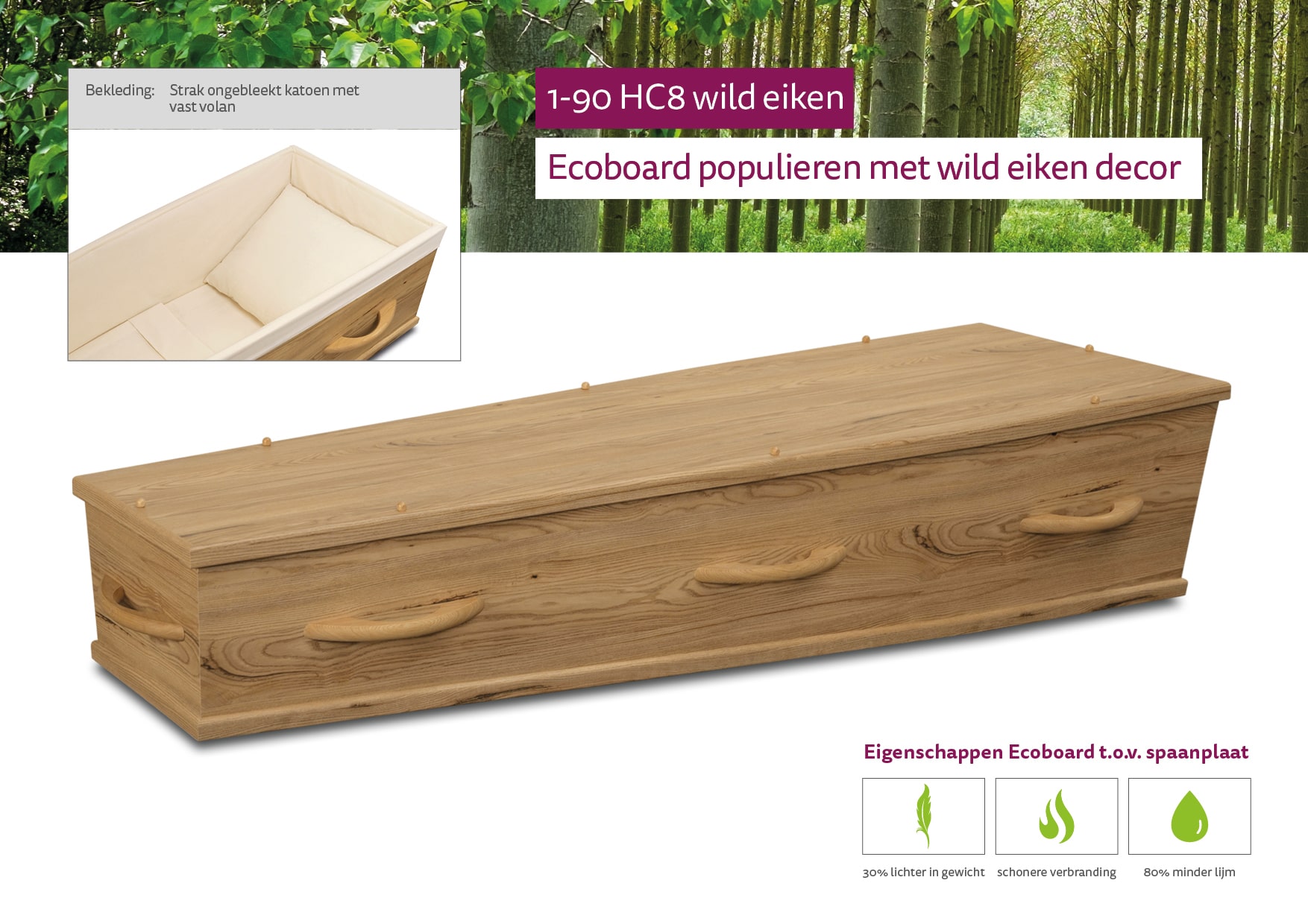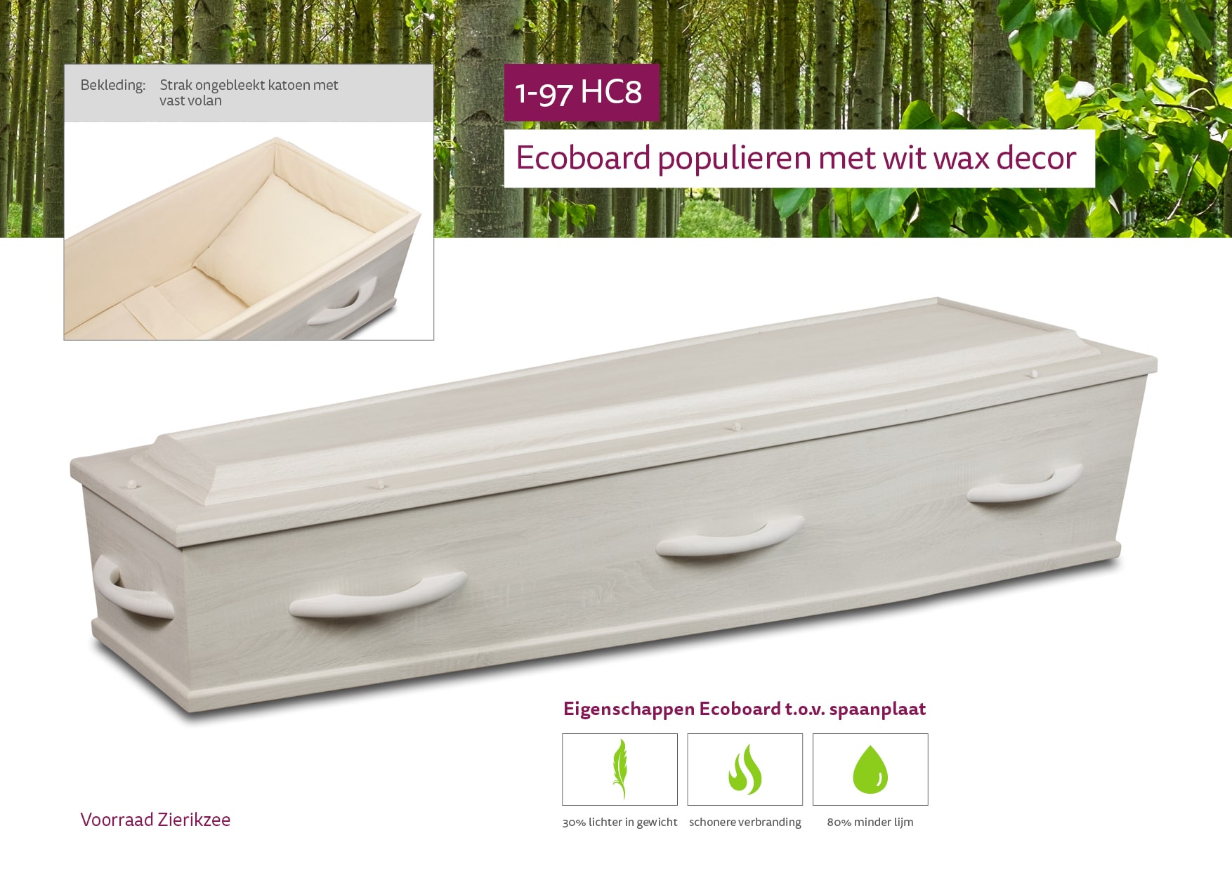 Wij bieden een brede collectie uitvaartkisten: van eenvoudig en ingetogen tot duurzaam of exclusief. Onze basis bestaat uit EcoBoard – geperst populierenhout met 85% minder schadelijke stoffen dan spaanplaat – licht van gewicht én vriendelijk voor het milieu.