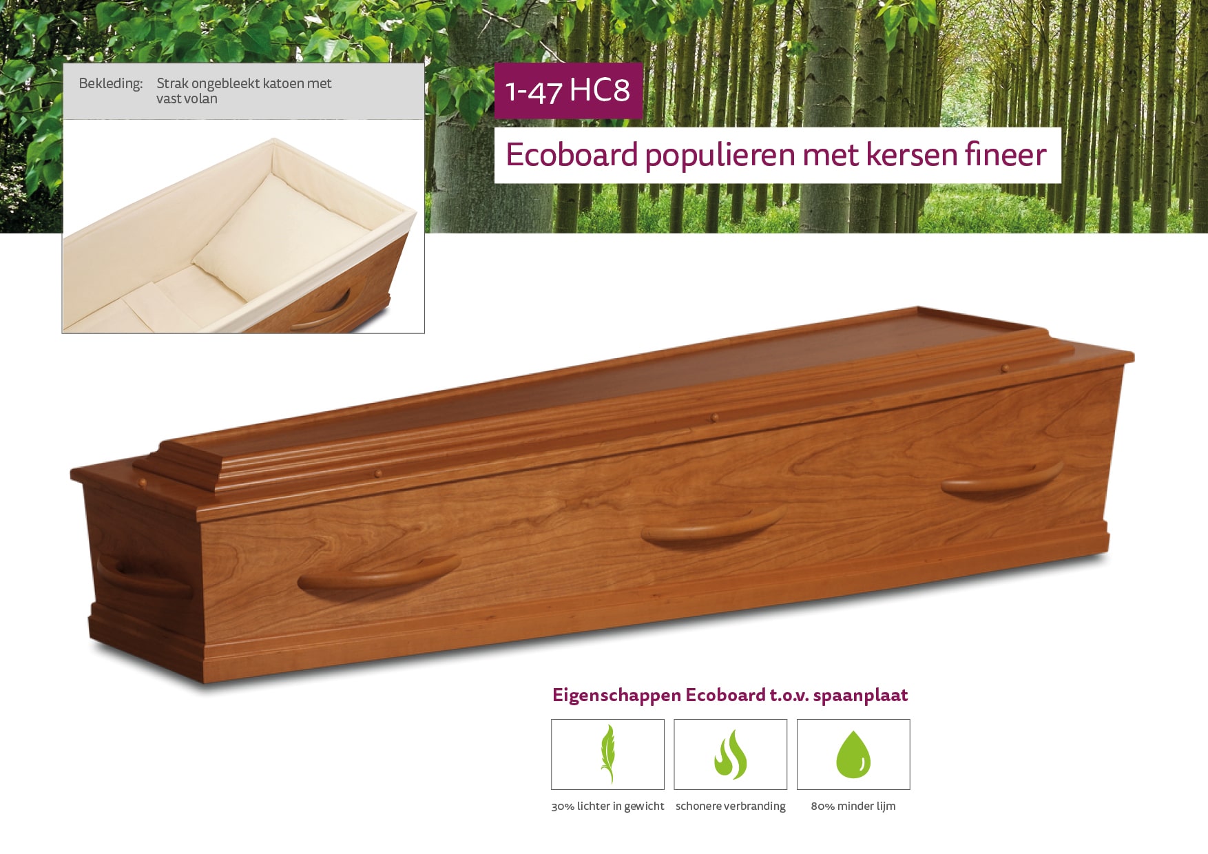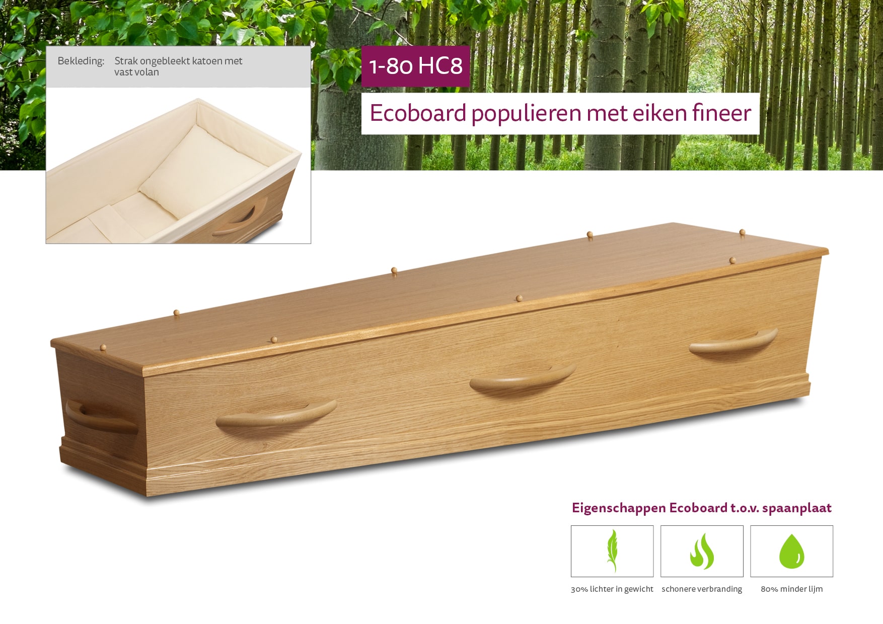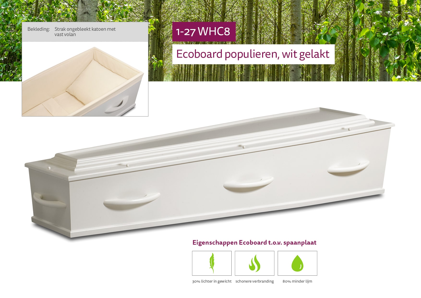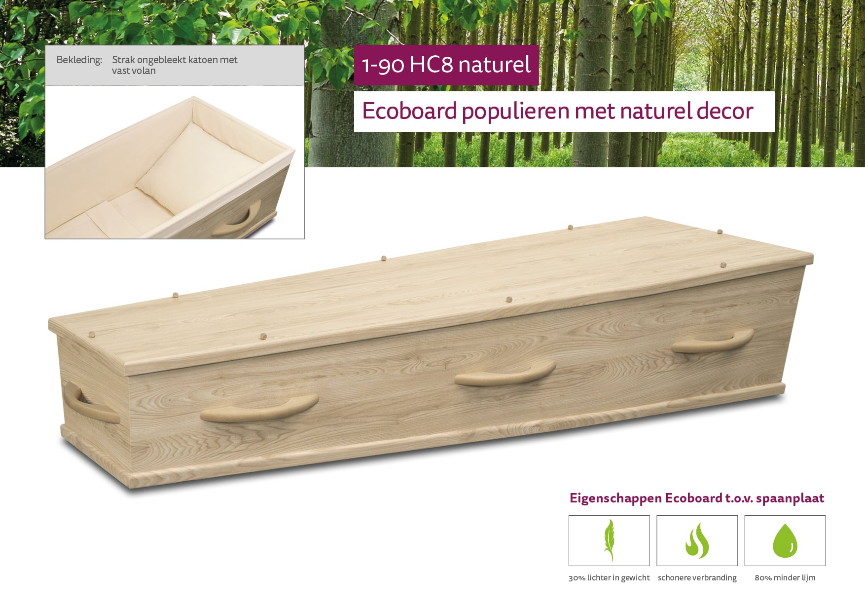 Wij bieden een brede collectie uitvaartkisten: van eenvoudig en ingetogen tot duurzaam of exclusief. Onze basis bestaat uit EcoBoard – geperst populierenhout met 85% minder schadelijke stoffen dan spaanplaat – licht van gewicht én vriendelijk voor het milieu.