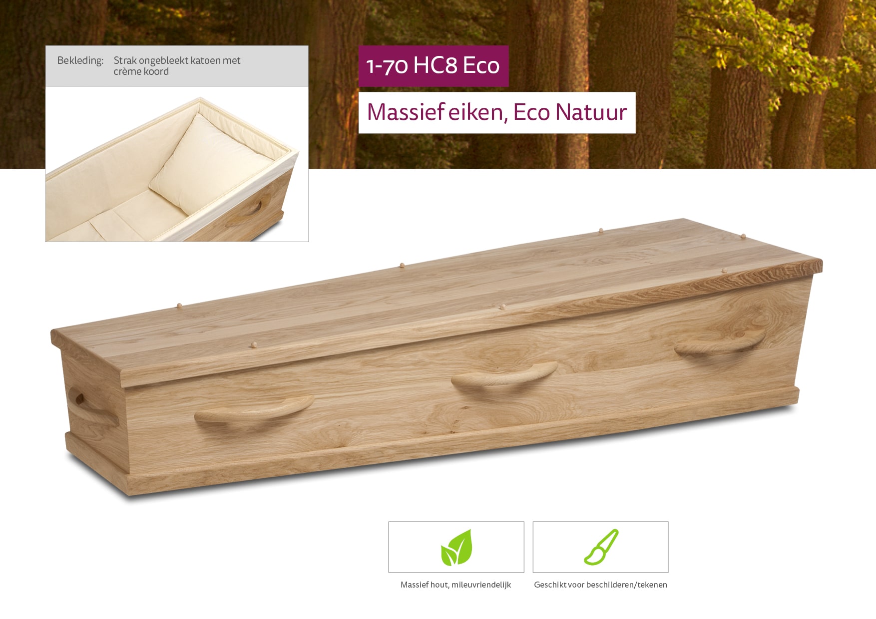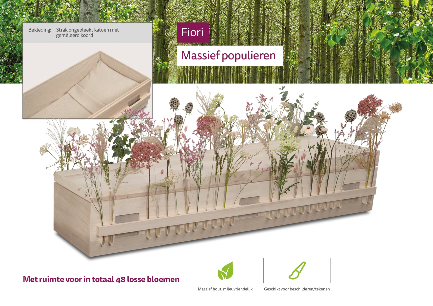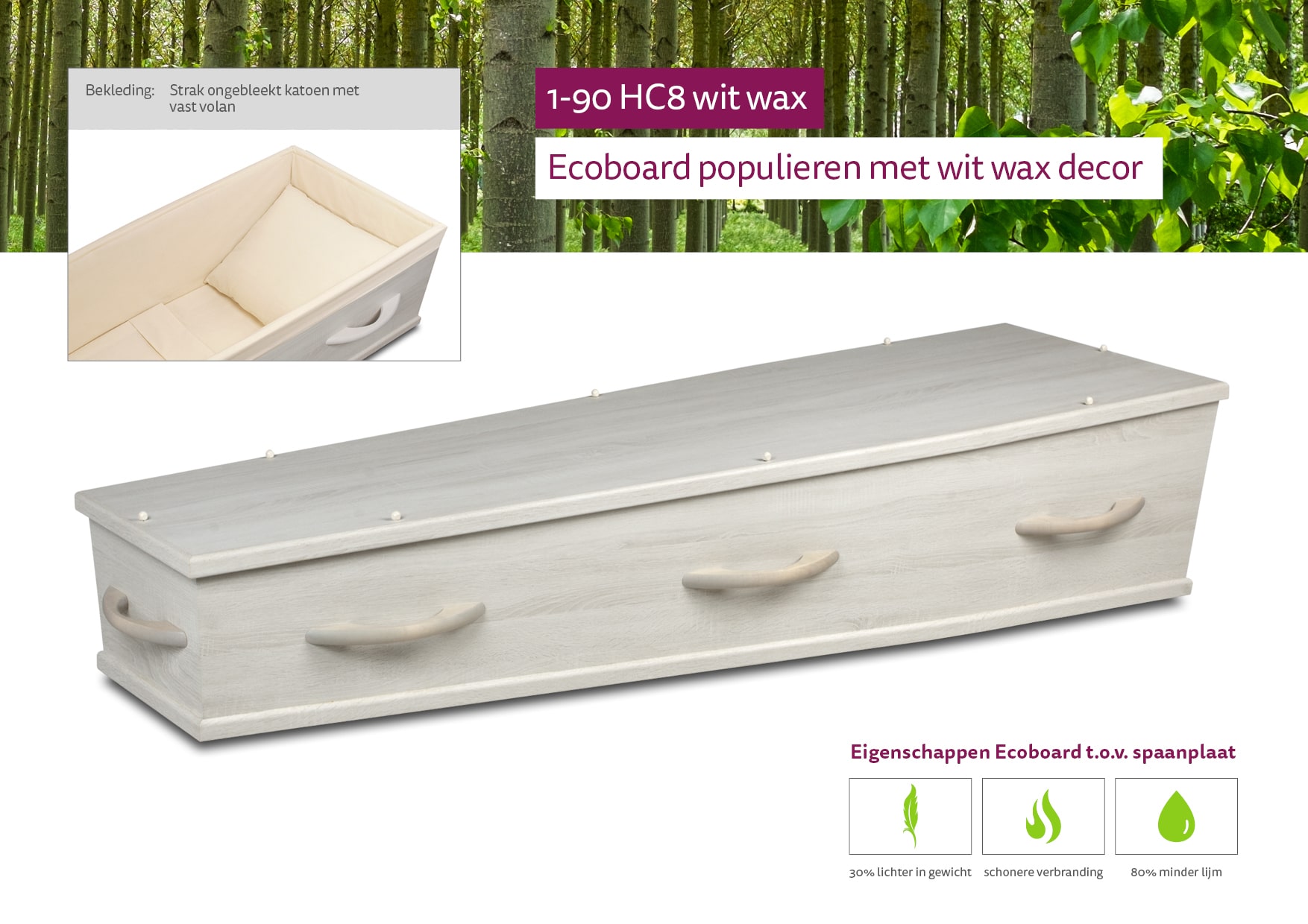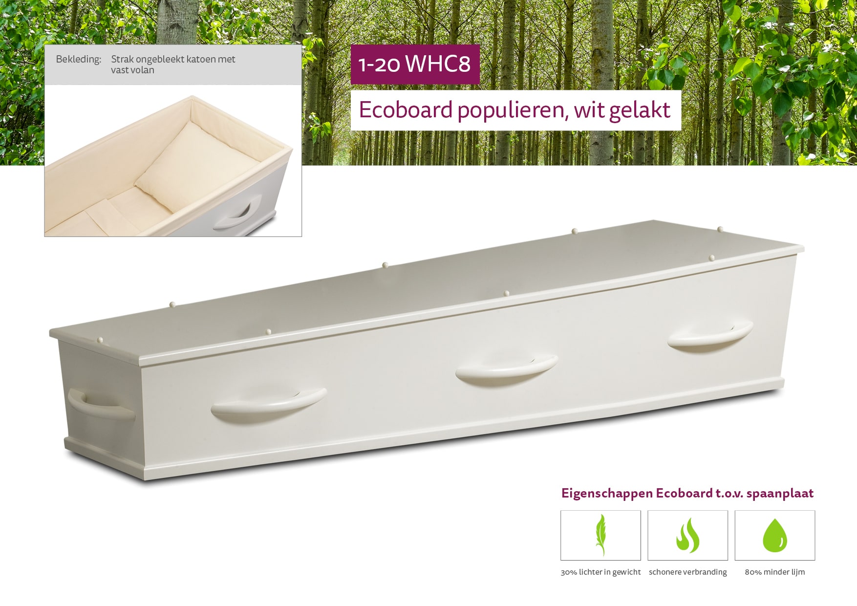 Wij bieden een brede collectie uitvaartkisten: van eenvoudig en ingetogen tot duurzaam of exclusief. Onze basis bestaat uit EcoBoard – geperst populierenhout met 85% minder schadelijke stoffen dan spaanplaat – licht van gewicht én vriendelijk voor het milieu.